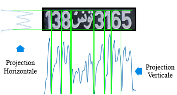Cuando se calculan todos los valores a lo largo de todas las líneas en la dirección horizontal, se obtiene el histograma de proyección horizontal. El valor medio del histograma se utiliza como umbral para determinar los límites superior e inferior. El área central cuyo segmento del histograma es mayor que el umbral se registra como el área delimitada por los límites superior e inferior. Entonces de la misma manera calculamos el histograma de proyección vertical pero cambiando las filas por las columnas de la imagen para tener los dos límites de cada carácter (izquierda y derecha).