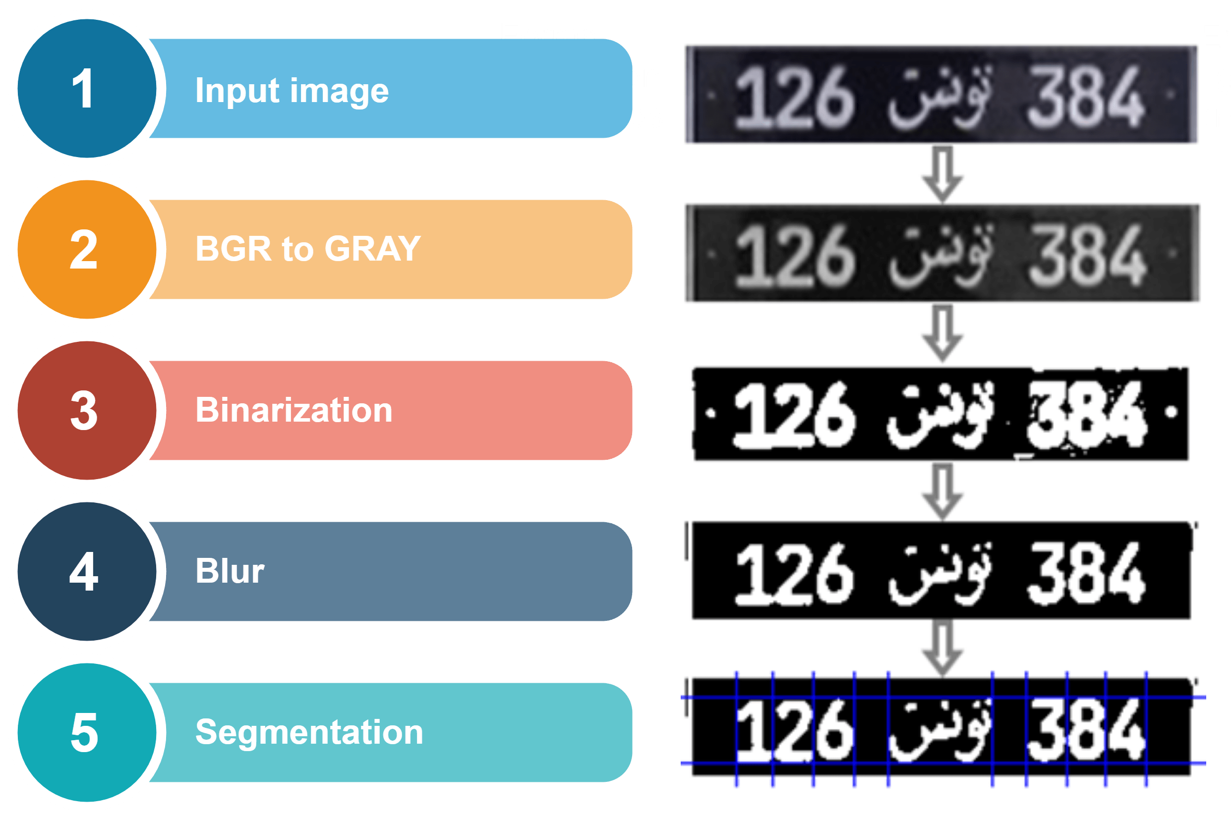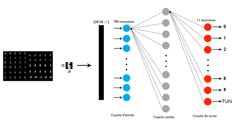 Para aprovechar al máximo los datos disponibles para el aprendizaje, cortamos cada carácter individualmente redimensionándolo en un cuadrado después de aplicar los mismos pasos de procesamiento de imagen utilizados antes de la segmentación de la matrícula. Como resultado, obtuvimos un conjunto de datos compuesto por 11 clases y para cada clase tenemos 30-40 imágenes de 28X28 píxeles en formato PNG; números del 0 al 9 y la palabra en árabe (Túnez).