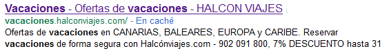 Este snippet se ha obtenido mediante la consulta a Google de “vacaciones”; figura en cuarta posición. Fijaos que en este caso se ha dedicado todo un subdominio para incorporar la palabra clave “Vacaciones” en primera posición en la URL. Por otro lado también es la primera en el título. Recordar que el orden de las palabras clave también influye en la URL y título de la página. La importancia aumenta cuanto más a la izquierda y decrece cuanto más a la derecha. Esta es la principal razón de porqué aparecen cuartos ante la consulta “vacaciones”, pero no la única, además la página tiene un PR4 fruto de que tiene una buena cantidad de enlaces de dominio apuntando directamente a ella. A este nivel no basta con el SEO on PAGE (Seo en la página), en este grado de competencia es necesario apoyarse en el SEO OFF Page (Seo externo o seo fuera de la página) que consiste básicamente en lograr enlaces apuntando a la página. Fijaos que Halcon Viajes no ha renunciado al Branding. Por otro lado la descripción rebasa los 155 caracteres, ante esta situación Google mostrará puntos suspensivos para indicar que no se ha mostrado toda la descripción..