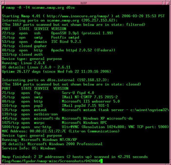 En la salida anterior, se puede ver que nmap se acercó con la huella digital TCP / IP del sistema operativo que se ejecuta en máquinas remotas y es más específico sobre el puerto y los servicios que se ejecutan en los hosts remotos.